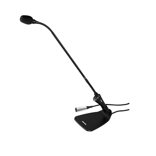 Gooseneck cardioid microphone consists of integrated desktop base, inline preamplifier and LED lighting for installed sound reinforcement or conferencing. It features a dual-section cable for positioning and Commshield RF Filtering for interference.