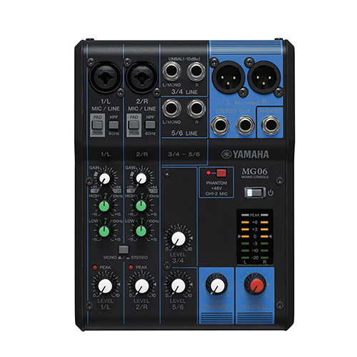 The MG06 from Yamaha is a compact six-input mixer for small performances, lectures, recordings and similar applications. The mixer features two mic/line combo inputs with D-PRE mic preamps as well as four 1/4″ line inputs with stereo level controls.